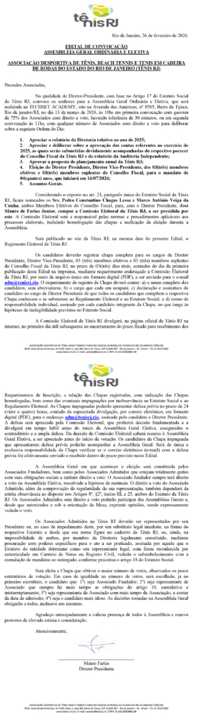 Posted on 26 de fevereiro de 2026 Edital de Convocação – AGOE 2026 – TÊNIS RJ Navegação de Post Anterior Edital de Convocação da AGO 2025 da Tênis RJPróxima Regulamento Eleitoral – 2026 Notícias relacionadas Niterói recebe etapa de torneio internacional de Beach Tennis